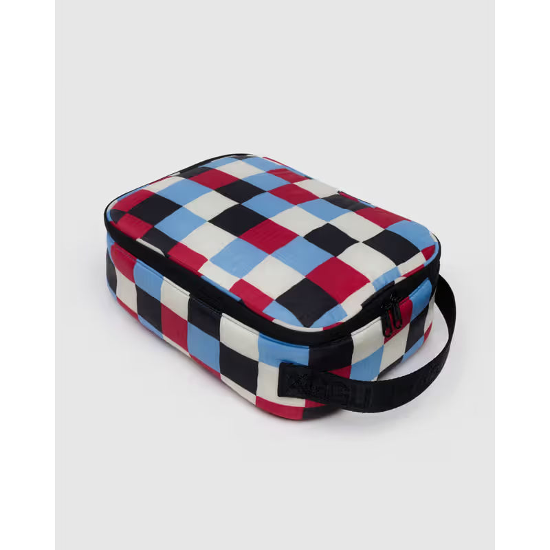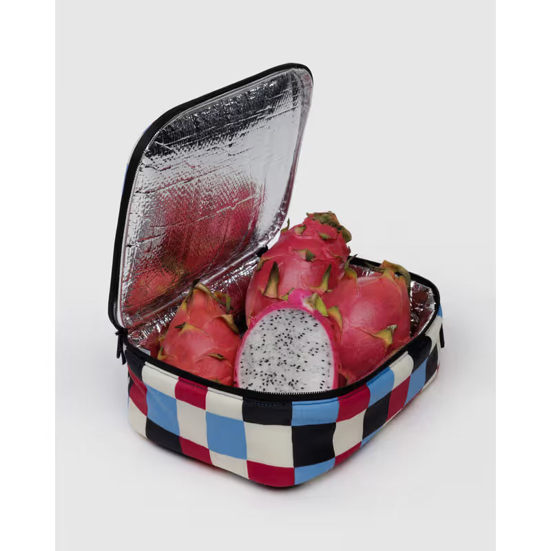 The Baggu Lunch Box - Painted Check is a compact insulated lunch bag designed to fit easily into your bag or backpack while keeping your meal cool and cushioned.