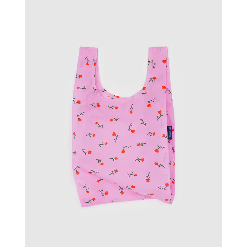 The Baby Baggu Painted Wildflower is a compact, reusable shopping bag perfect for carrying your lunch, a six-pack, or extra shoes. Made from recycled ripstop nylon, it comfortably holds up to 50 lbs and folds neatly into a flat 4" × 4" pouch for easy storage.