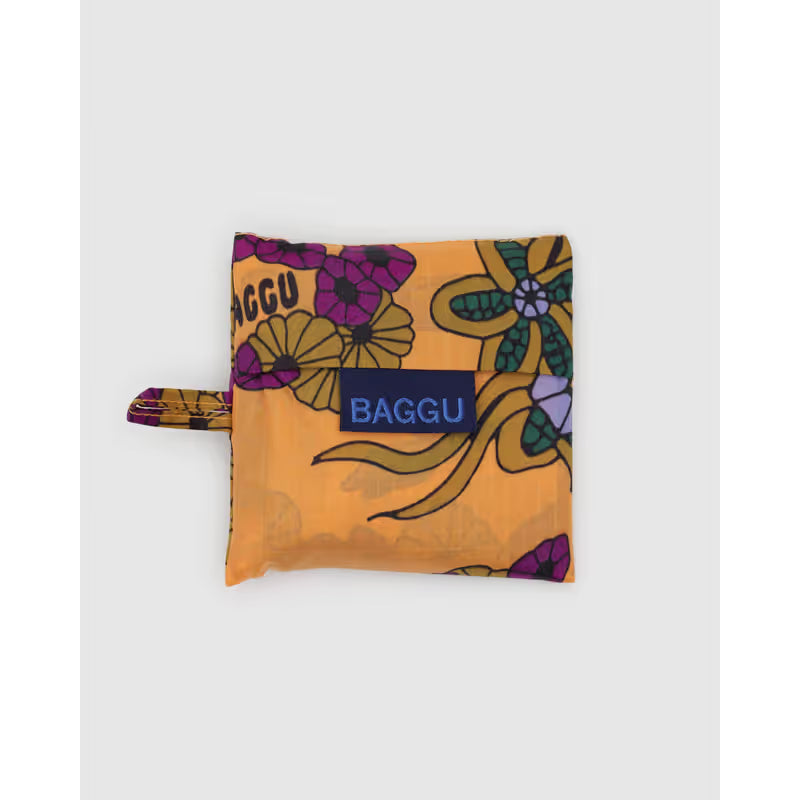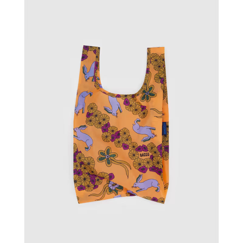 The Baby Baggu Wild Rabbit is a compact, reusable shopping bag perfect for carrying your lunch, a six-pack, or extra shoes. Made from recycled ripstop nylon, it comfortably holds up to 50 lbs and folds neatly into a flat 4" × 4" pouch for easy storage.