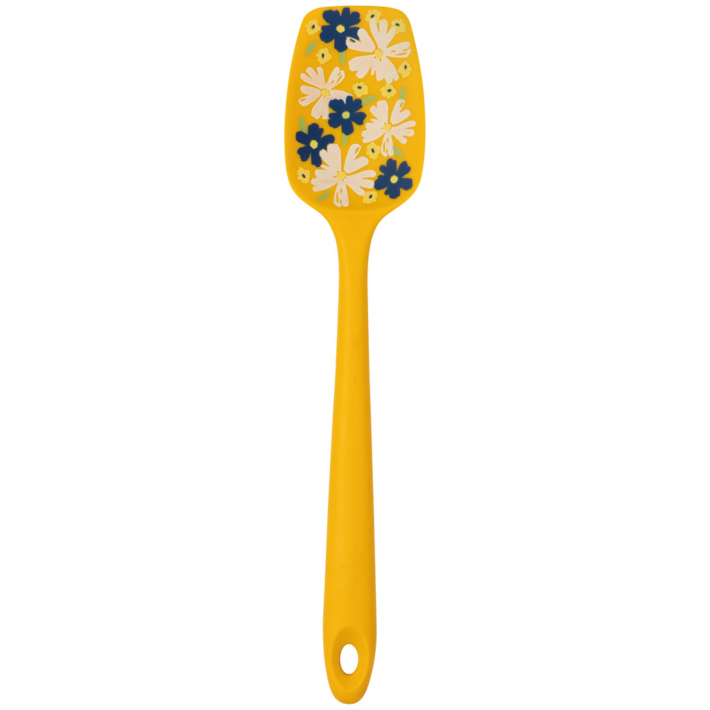 Adorned with vibrant floral designs, it combines artistic elegance with practical versatility for mixing, stirring, and scraping.