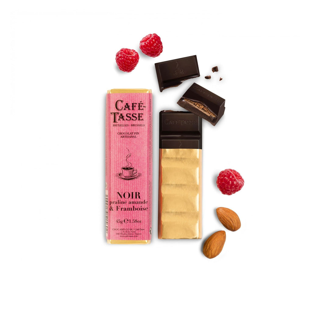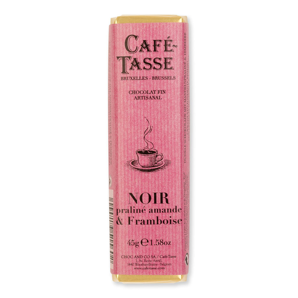 Enjoy the rich intensity of Cafe Tasse Dark Chocolate enhanced with crunchy almond praliné and tangy bursts of raspberries. This thoughtfully crafted bar provides a comforting combination of flavours.