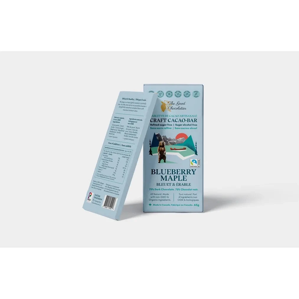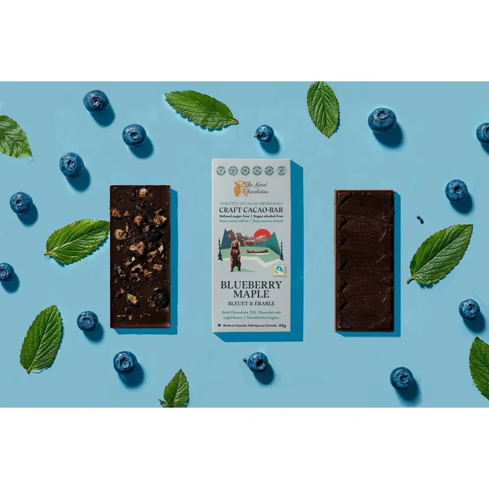 Indulge in GOOD Chocolatier's Blueberry Maple Bar, topped with local organic blueberries for a rich and delicious treat. With 75% dark cacao, this simple and wholesome bar is perfect for a cozy afternoon snack or sharing with friends.