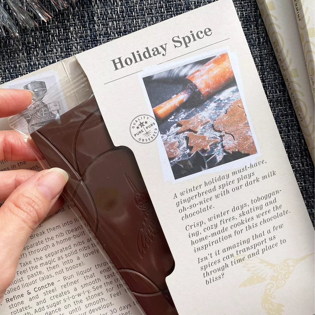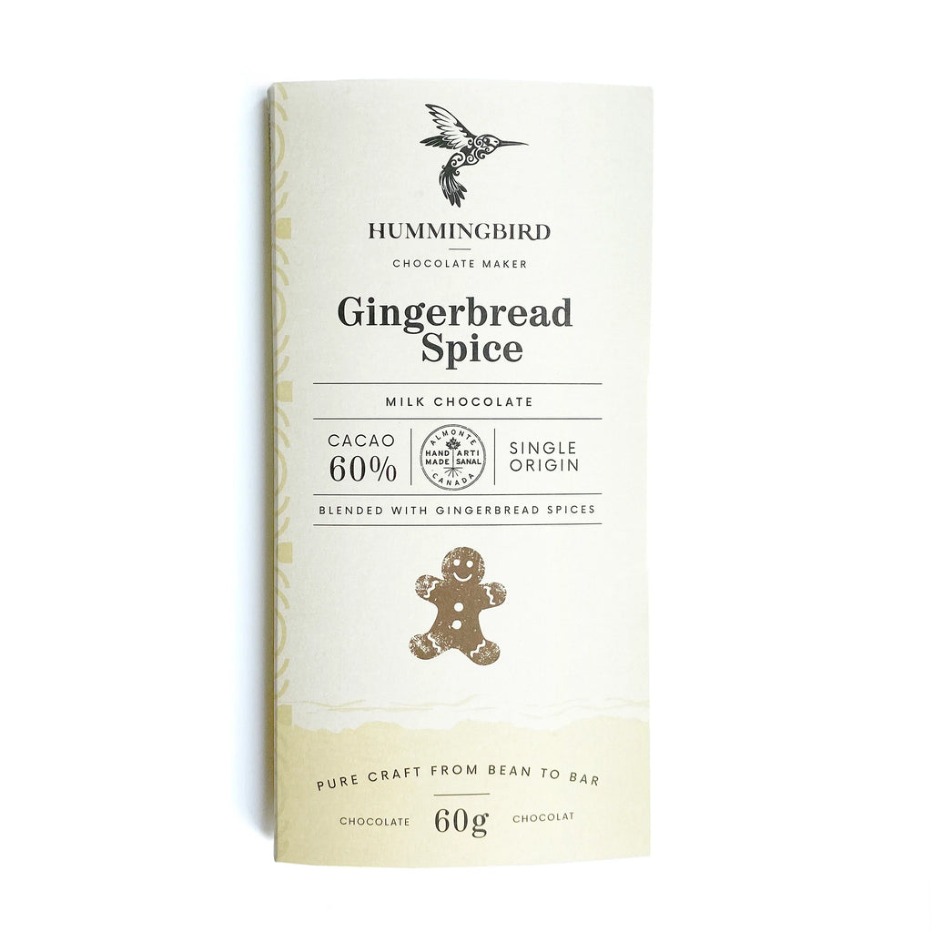 60% Dark Milk chocolate made from Ghanaian cacao, blended with gingerbread spices.
