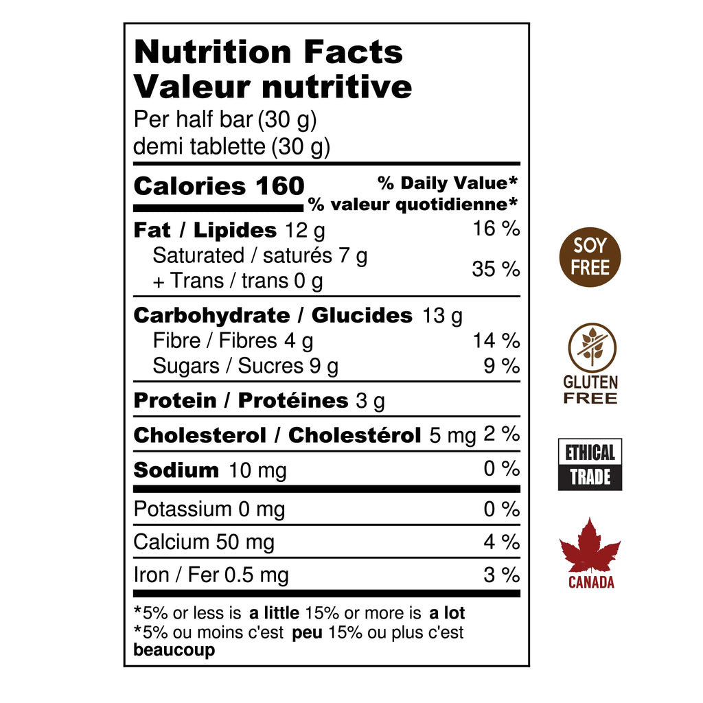 Bean to bar, Gluten-free, Soy-free, Ethical Trade, Made in Canada