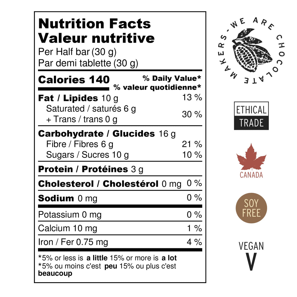 Bean to bar, Vegan, Gluten-free, Soy-free, Ethical Trade, Made in Canada