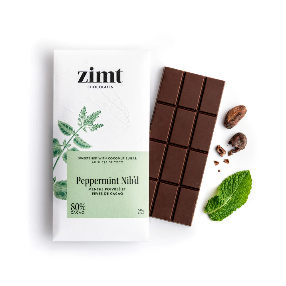 Introducing the Zimt Peppermint Nib'd Chocolate Bar, a truly classy and decadent treat made just for you. The 80% dark chocolate is expertly combined with crunchy cocoa nibs and refreshing peppermint essential oil, all sweetened with a touch of coconut sugar. Enjoy the perfect balance of flavour and cocoa content in every bite.