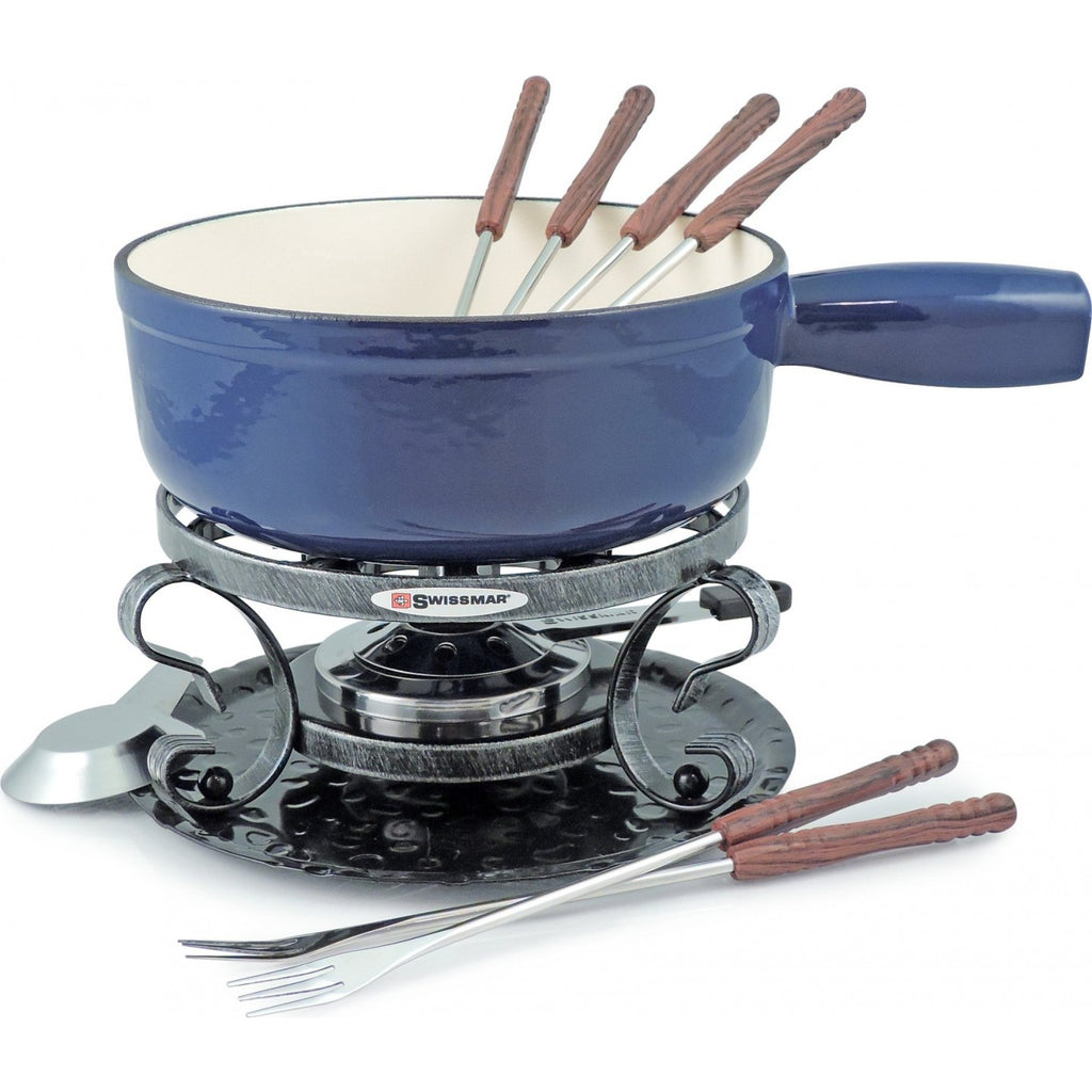 Traditional style cast iron cheese fondue set includes matte black pot, black wrought iron rechaud, six cheese fondue forks and fondue burner. Pot is enameled inside and provides even heat distribution. Can be used on all heat sources and is easy to clean.