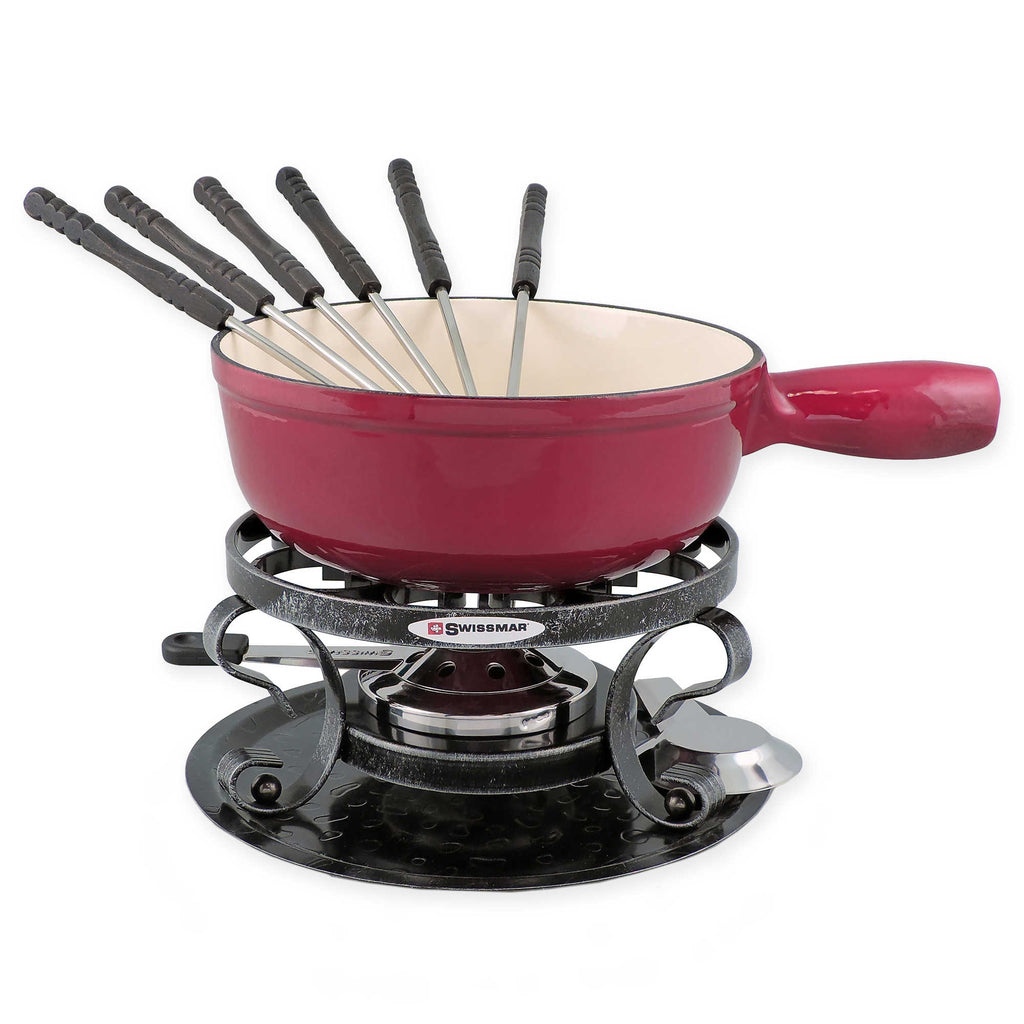 Traditional style cast iron cheese fondue set includes matte black pot, black wrought iron rechaud, six cheese fondue forks and fondue burner. Pot is enameled inside and provides even heat distribution. Can be used on all heat sources and is easy to clean.