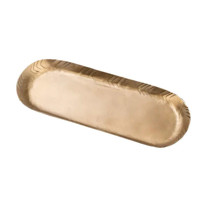 Effortlessly elevate any surface with the Large Forged Iron Oval Tray. Hand forged using traditional Indian artisanry, these delicate iron trays feature an imprinted chevron pattern and are designed to hold various items. Use it to display jewelry, coins, or key rings, adding a touch of elegance to your home decor.