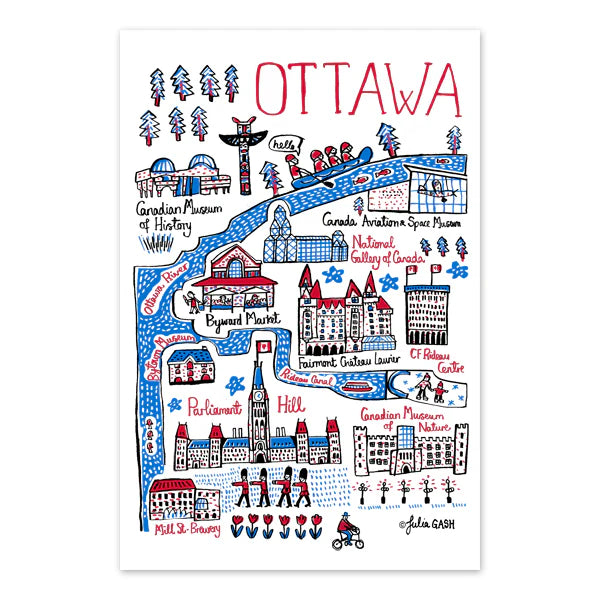 Bring the beauty Ottawa to your life with this hand-illustrated postcard set by artist Julia Gash. Made with 110lb card stock, these 2-sided prints feature iconic landmarks that will capture your heart. Perfect for sending a touch of charm to loved ones or for displaying as decor.