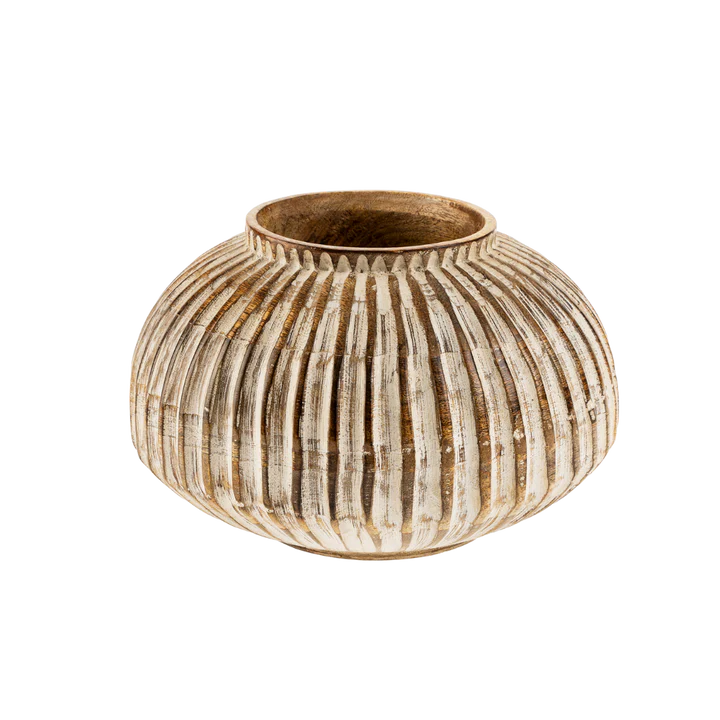 Enhance your home decor with the Small Esme Carved Wooden Vase. Crafted with care from mango wood, its intricate design is brought to life with a delicate whitewash finish. Elevate any room with this stunning and unique piece of artistry.