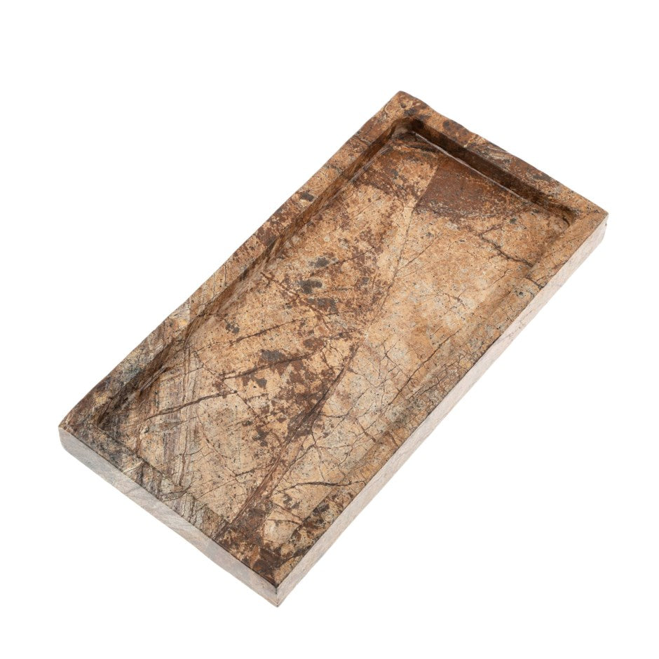 Enhance your space with the natural beauty of our Small Rainforest Marble Tray. Hand carved from rainforest marble in India, each unique tray features a variety of earthy tones and intricate veining. Perfect for organizing items in the bathroom or displaying decor in the entryway. Each piece is one-of-a-kind, making it a special addition to your home.