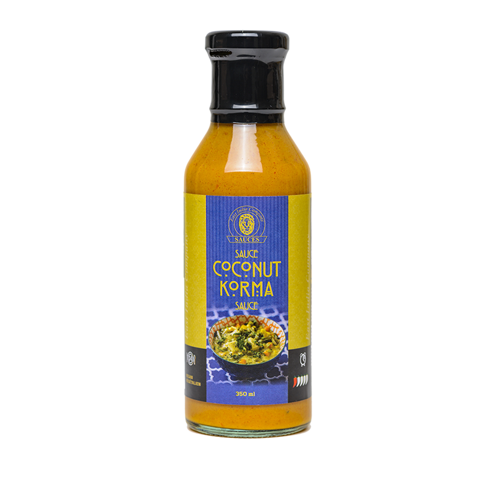Coconut Korma is a smooth, coconut-based sauce infused with cumin, coriander, fresh ginger, and garlic. Free from additives, preservatives, and gluten, this vegetarian-friendly sauce pairs perfectly with vegetables, seafood, or chicken.