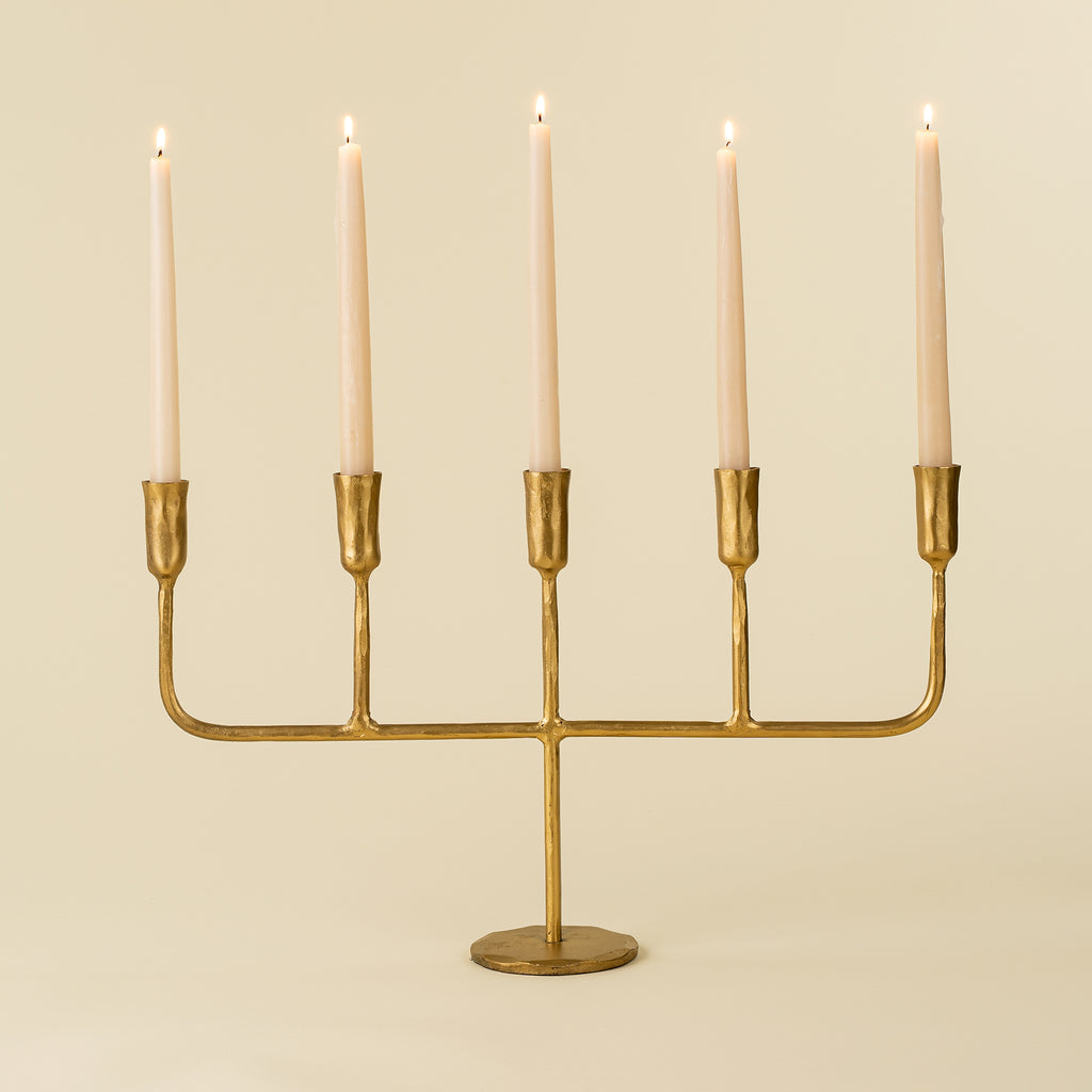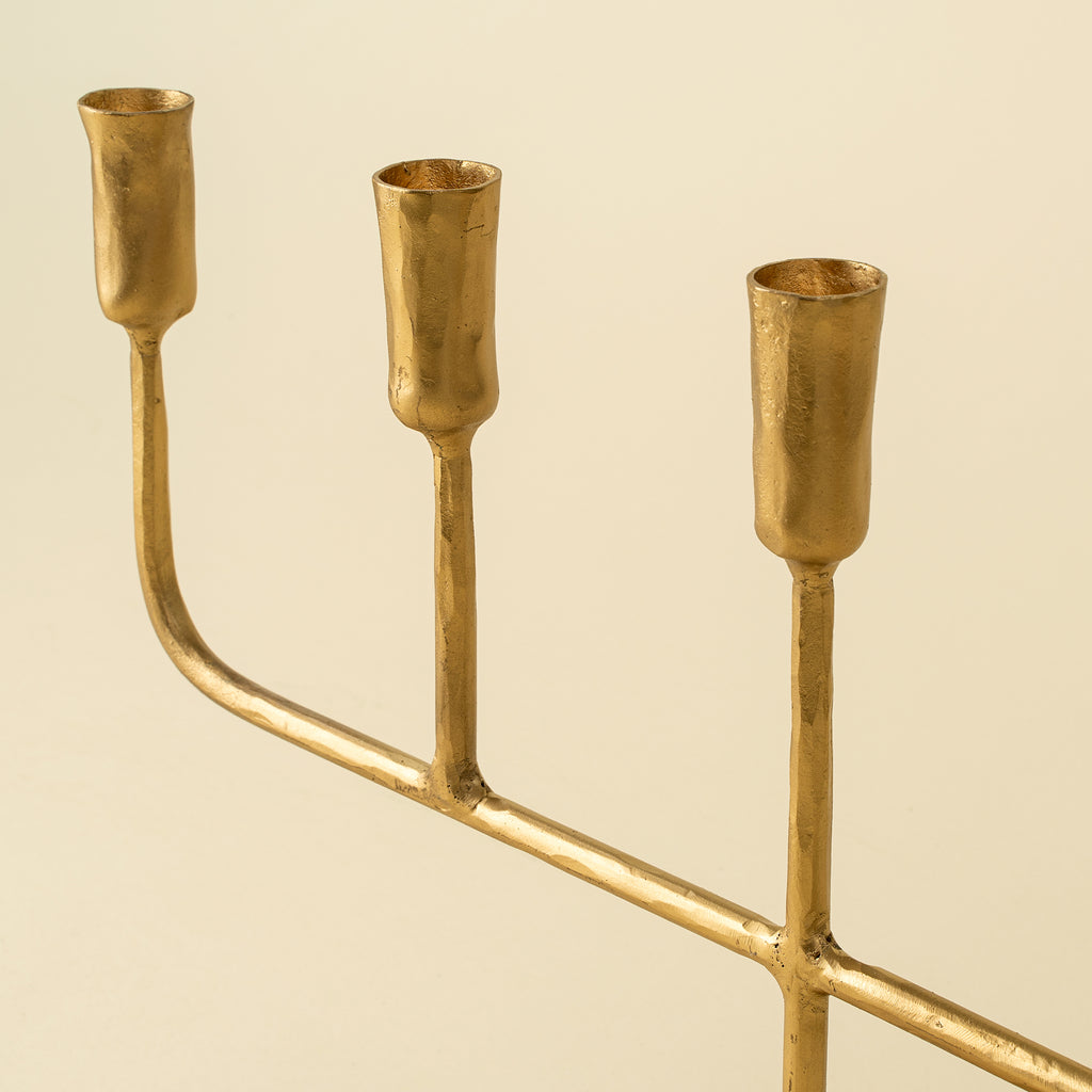 Elevate your decor with the Gold Luna Candelabra, crafted by hand from solid brass using traditional methods. Its elegant design, inspired by the Luna candle holders, adds a luxurious touch and warm glow to any setting. Perfect for taper candles, this candelabra enhances tablescapes, mantels, and special occasions with timeless sophistication and charm.