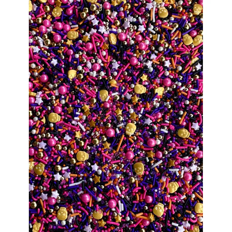 Create dazzling desserts with the Sweetapolita Voodoo Sprinkle Medley. This unique mix combines vibrant sprinkles, candy shapes, and metallic dragées to add a touch of glitz and glam to your treats.