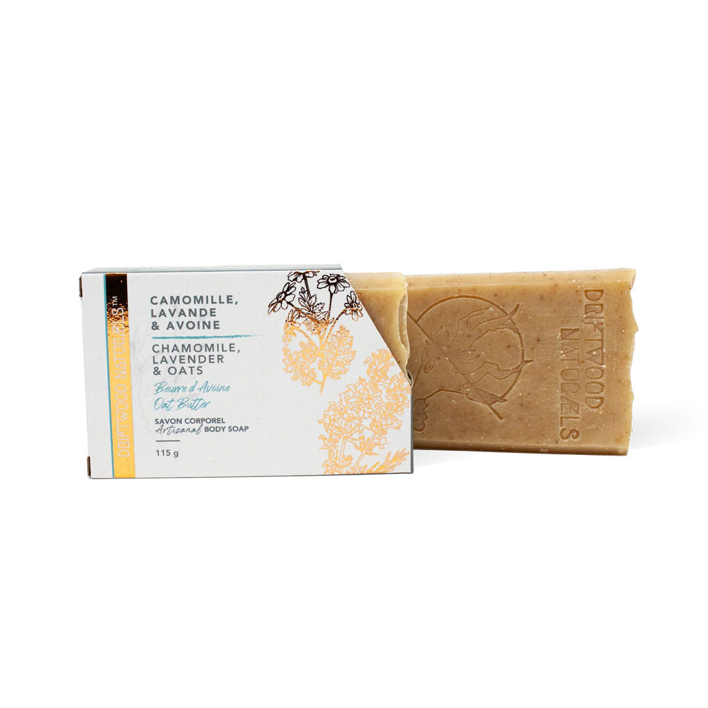 Introducing Driftwood Chamomile, Lavender, & Oats Soap. Made with all-organic ingredients, including Oat Butter for soothing sensitive skin and gentle exfoliation. Formulated with nourishing vegetable oils and butters like Almond Oil, Castor Oil, and Shea Butter, it leaves your skin moisturized, clean, and radiant. Perfect for sensitive skin types, with a gentle fragrance.