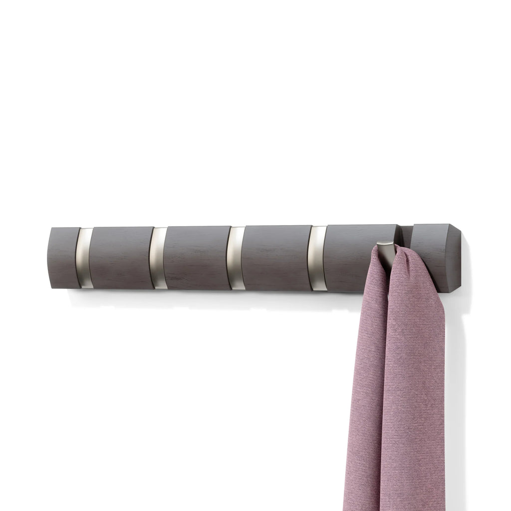Flip is a wall mounted coat rack with ample hanging space where you need it most. The clever design with multiple hooks that retract when not in use, has each one slipping neatly back into its groove for a sleek look and space-saving functionality. Thanks to the sleek profile and hidden mounting hardware, Flip mounts seamlessly to virtually any wall and offers styling that looks great in any entryway or foyer, regardless of how big or small it is.
