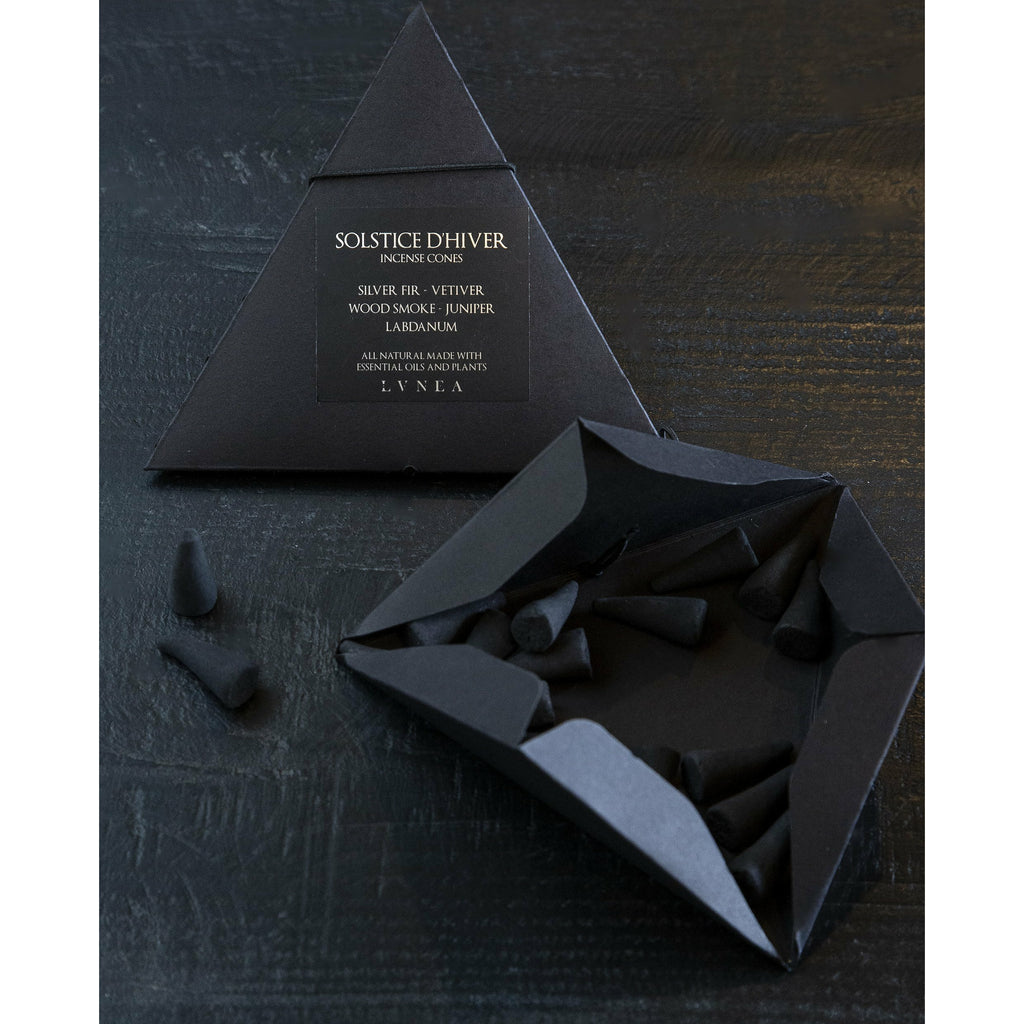 Vetiver, Silver Fir and Woodsmoke. Naturally perfumed charcoal incense cones housed in a recyclable black paper pyramid.