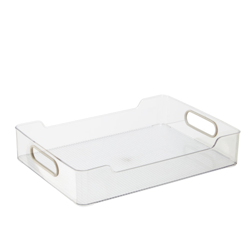 Ideal for organizing your kitchen or pantry, the Clear Storage Bin 12" makes it easy to store a variety of items such as fruit, produce, condiments, and drinks. With built-in handles, it is convenient to move and lift, making it a must-have for any household.