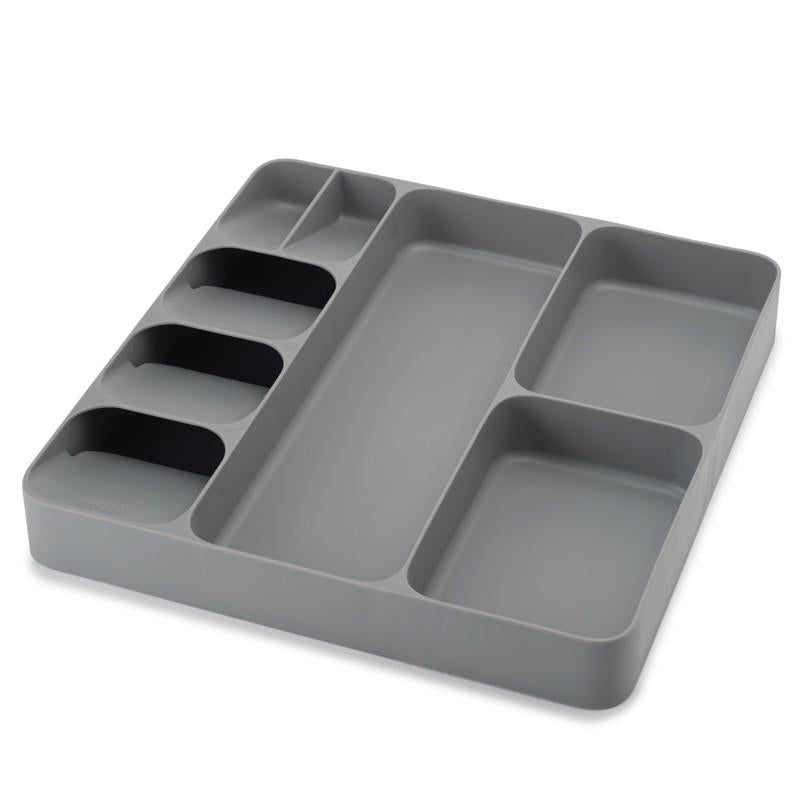 Organize messy cutlery drawers with this practical and smart storage solution. This unique tray combines five overlapping compartments for storing cutlery with three deep-sided compartments for holding utensils and gadgets. What's usually stored in two drawers can now be neatly organized into one, creating more space in your kitchen. Hand wash only.