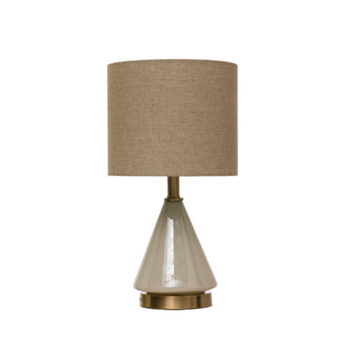 10-1/2" round x 20" H taupe glass table lamp with a cream linen shade and inline switch. 100 watt bulb max.