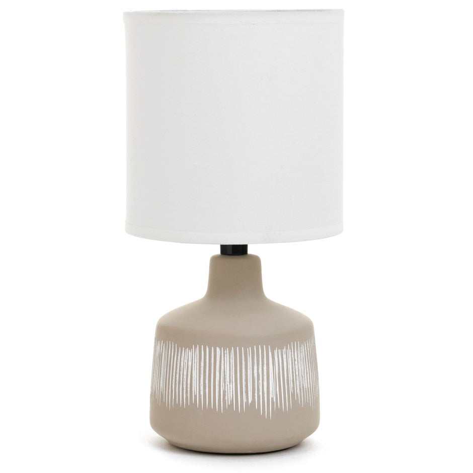 Light up your space with chic design. Our Taupe Etched Ceramic Table Lamp adds a modern, luxurious touch to any room with its small scale taupe ceramic body, etched detailing, and white shade. Illuminate your décor with style!