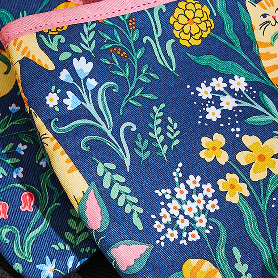 These microwave mitts showcase spirited ginger cats in playful moments—pouncing, peering, and tumbling through a vibrant garden—all set against a sophisticated navy canvas.