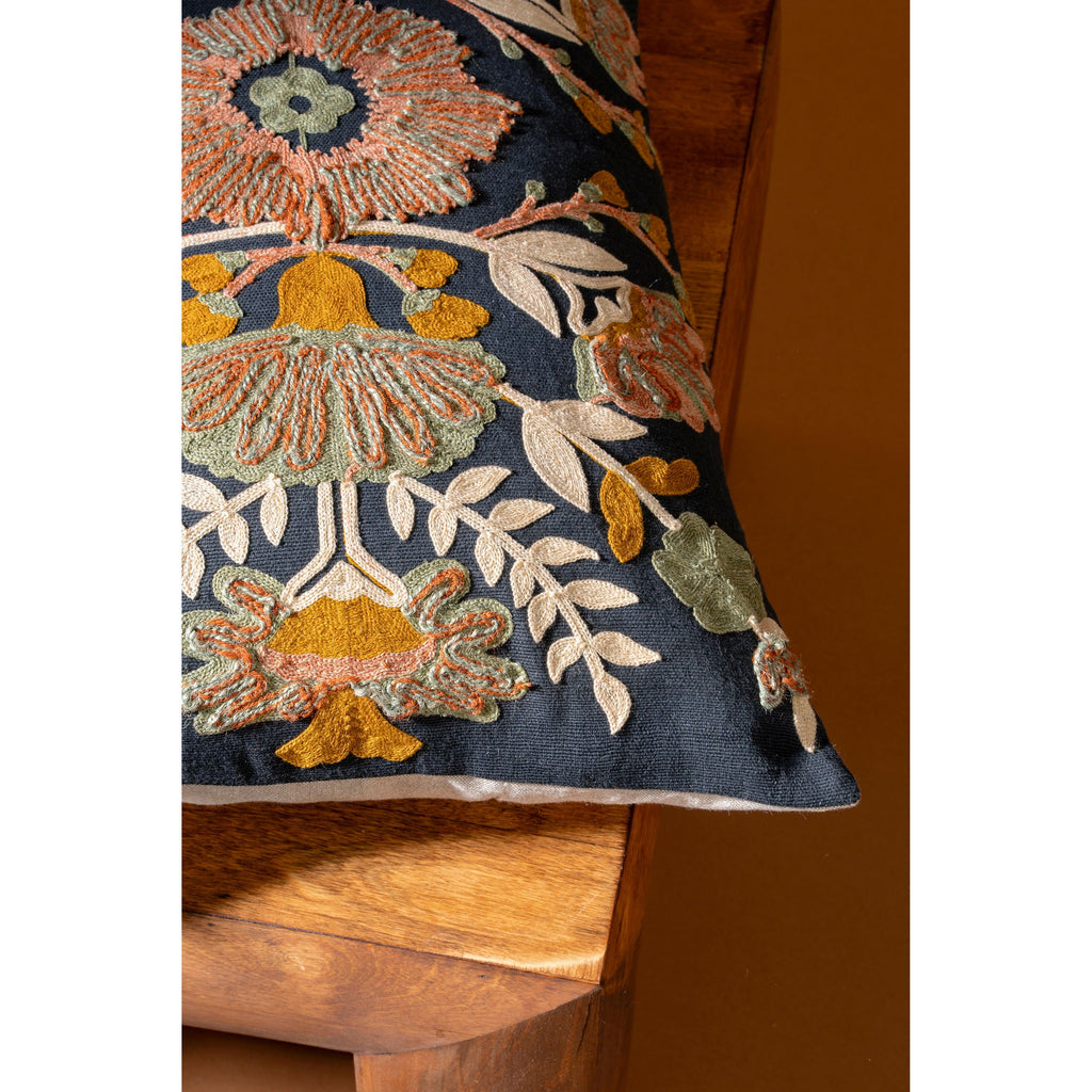 Enhance your space with the 16x24 Aster Embroidered Pillow, featuring vibrant botanical embroidery that stands out against a rich black background. Hand-embroidered on soft cotton, this lumbar pillow adds texture, depth, and artistic flair to any room. Perfect for sofas, beds, or accent chairs, it brings warmth and personality through its detailed craftsmanship and bold yet elegant design.