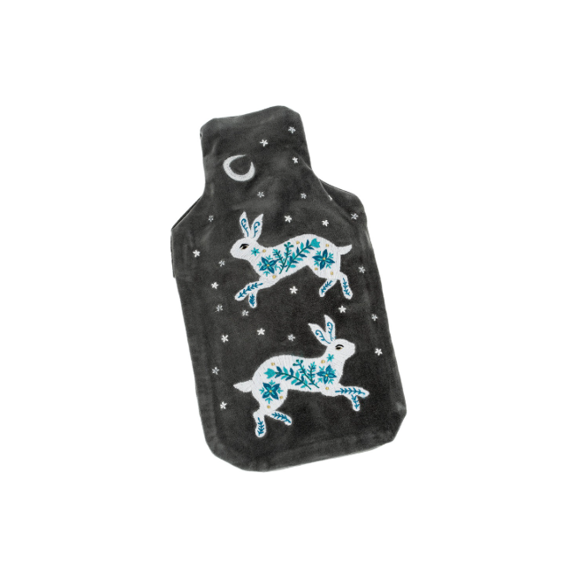 The Celestial Rabbit Velvet Hot Water Bottle offers cozy warmth wrapped in a soft grey velvet cover adorned with a charming embroidered rabbit, floral accents, and a crescent moon. Combining comfort and artistic design, it soothes tired muscles and enhances your relaxation routine. This sustainable and stylish hot water bottle makes a thoughtful gift for anyone seeking both practicality and a touch of whimsy.
