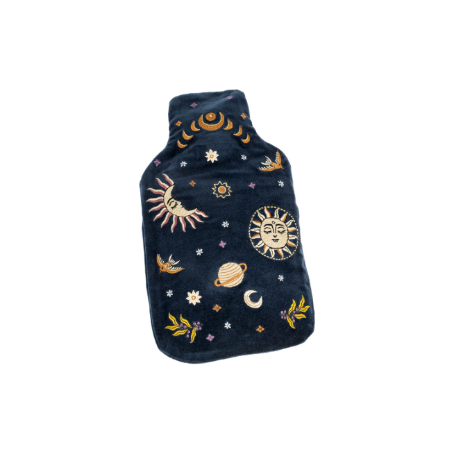 The Night Sky Velvet Hot Water Bottle combines soothing warmth with elegant design. Wrapped in a midnight blue velvet cover adorned with delicate celestial embroidery in warm tones, it offers comfort while easing tired muscles and relieving stress. This functional and beautiful accessory adds a charming touch to your cozy routine and makes a thoughtful, sustainable gift for relaxation and self-care.