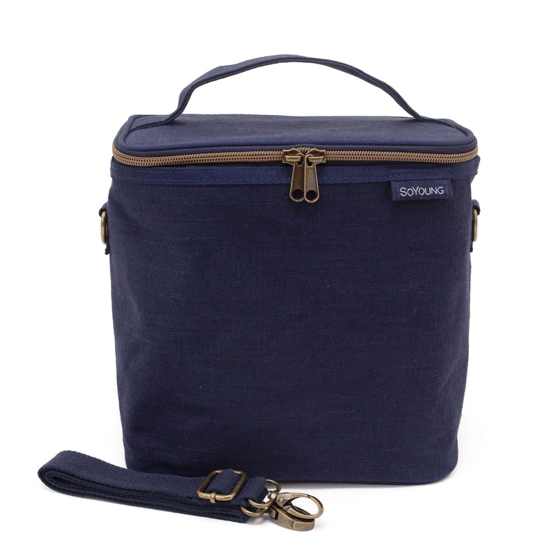 Deep blue like the night sky! We're loving the colour of this lovely linen lunch bag. A contemporary version of our large cooler bags, Lunch Poches (French for "Pocket") were designed to complement foodie, fashion and wellness focused lifestyles. It's time to stop using shopping bags to carry your lunch and elevate the lunch experience. Purposeful features include a removable insert lining for easy cleaning, a messenger strap to double as a purse, and an inspirational name tag to remind you to live with intention. Constructed of a signature linen blend with tonal trims and brass hardware.