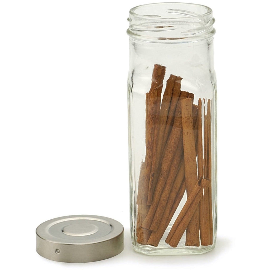 This large size bottle is ideal for cinnamon sticks, vanilla beans, saffron, and frequently used bulky herbs and spices. Clear glass with a stainless steel lid minus a plastic shaker insert.