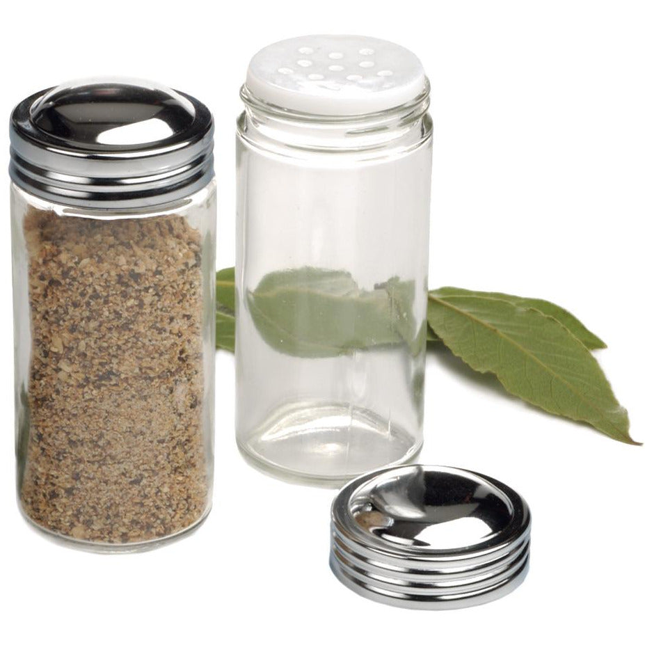 Organize your spices to keep them close at hand. Clear glass jars with screw-on chromed steel lid and plastic shaker insert.