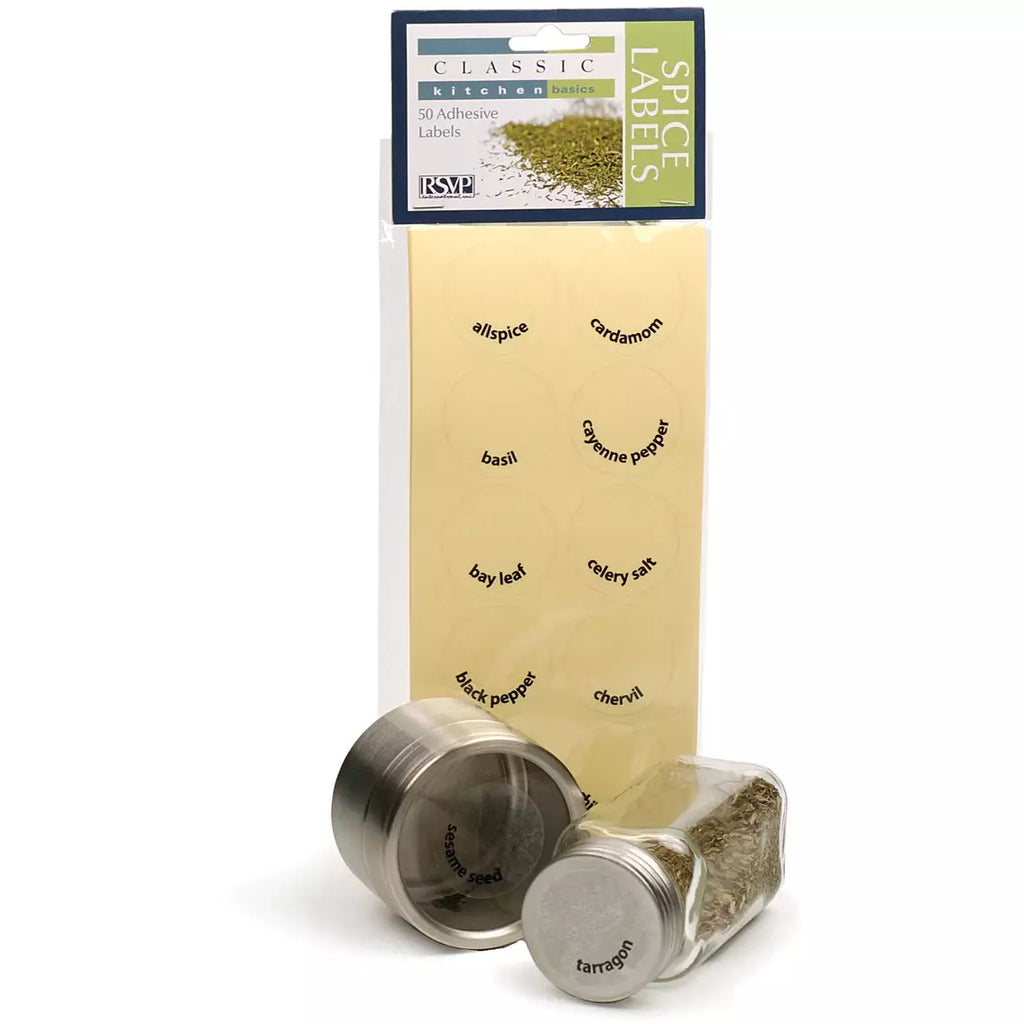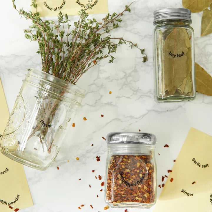 Label your spice jars in style! This set of 50 labels includes 45 preprinted spices and herbs and 5 blank labels so you can easily name your own.