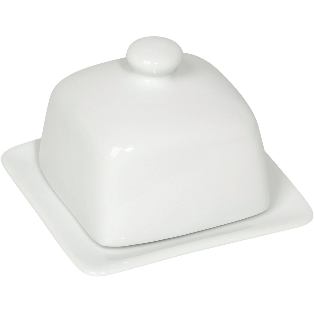 This simple and sophisticated white butter dish with a lid is perfect for the table.
