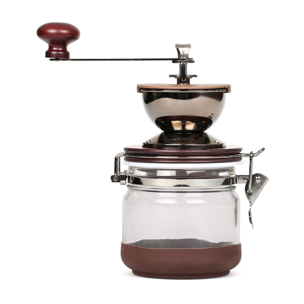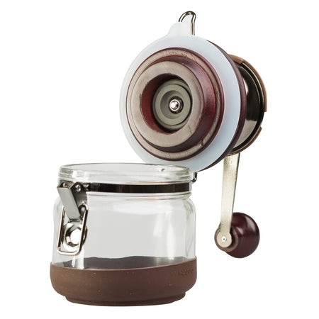 This traditional crank style hand grinder uses ceramic burrs to grind coffee, and has a removable and sealable glass jar underneath to store your coffee.