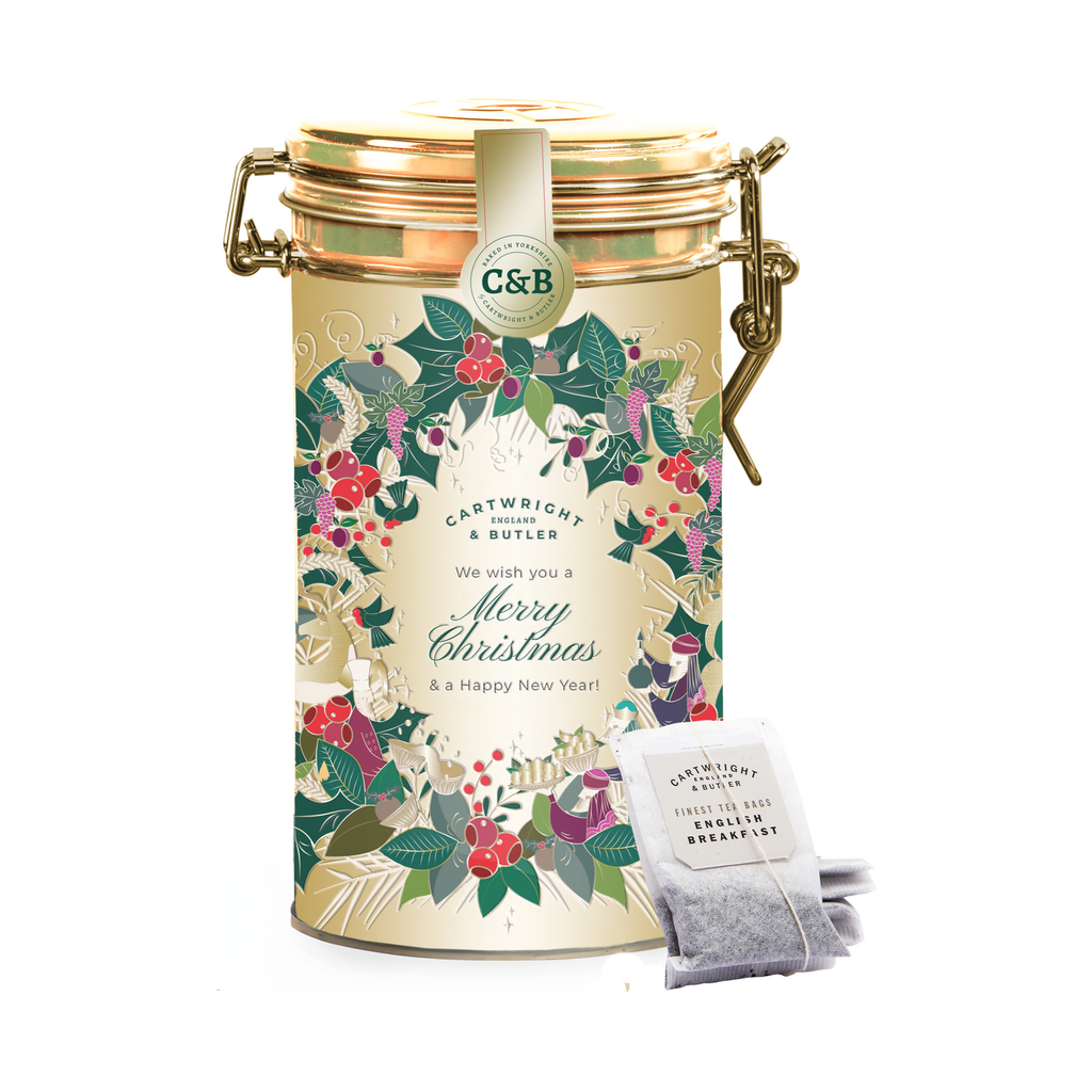 A stunning golden tin illustrated with the most festive of holly wreaths surrounding lovely English Breakfast teabags. The initial robust, full-bodied black leaf flavour gives way to the deep, malty undertones and rich finish that is characteristic of Ceylon