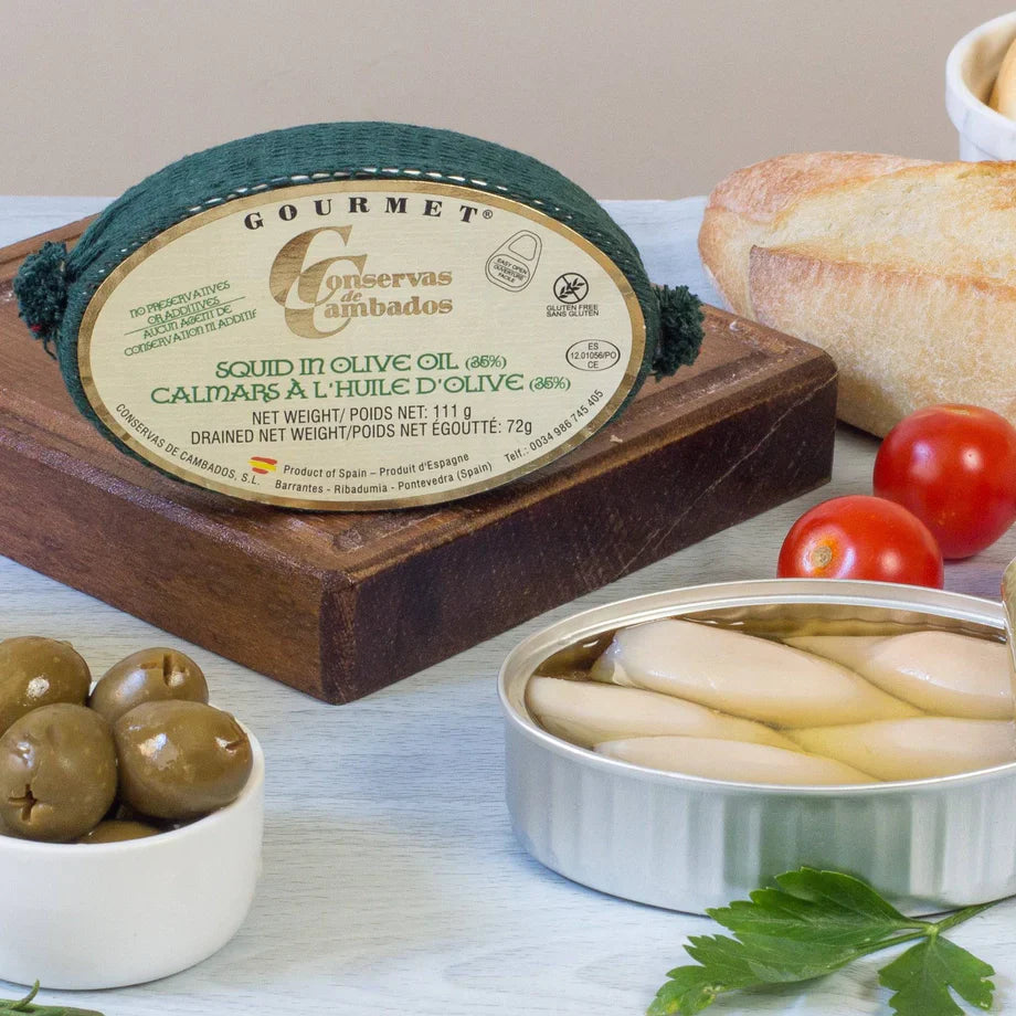 These super tender tiny squid make a great ‘tapa’. Simply place the can in hot water for 5 minutes and serve with crusty bread and a glass of Albarino.