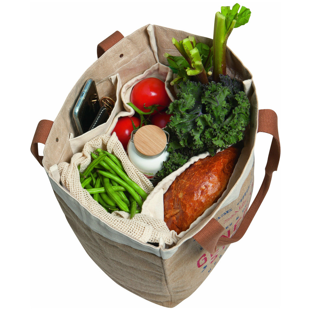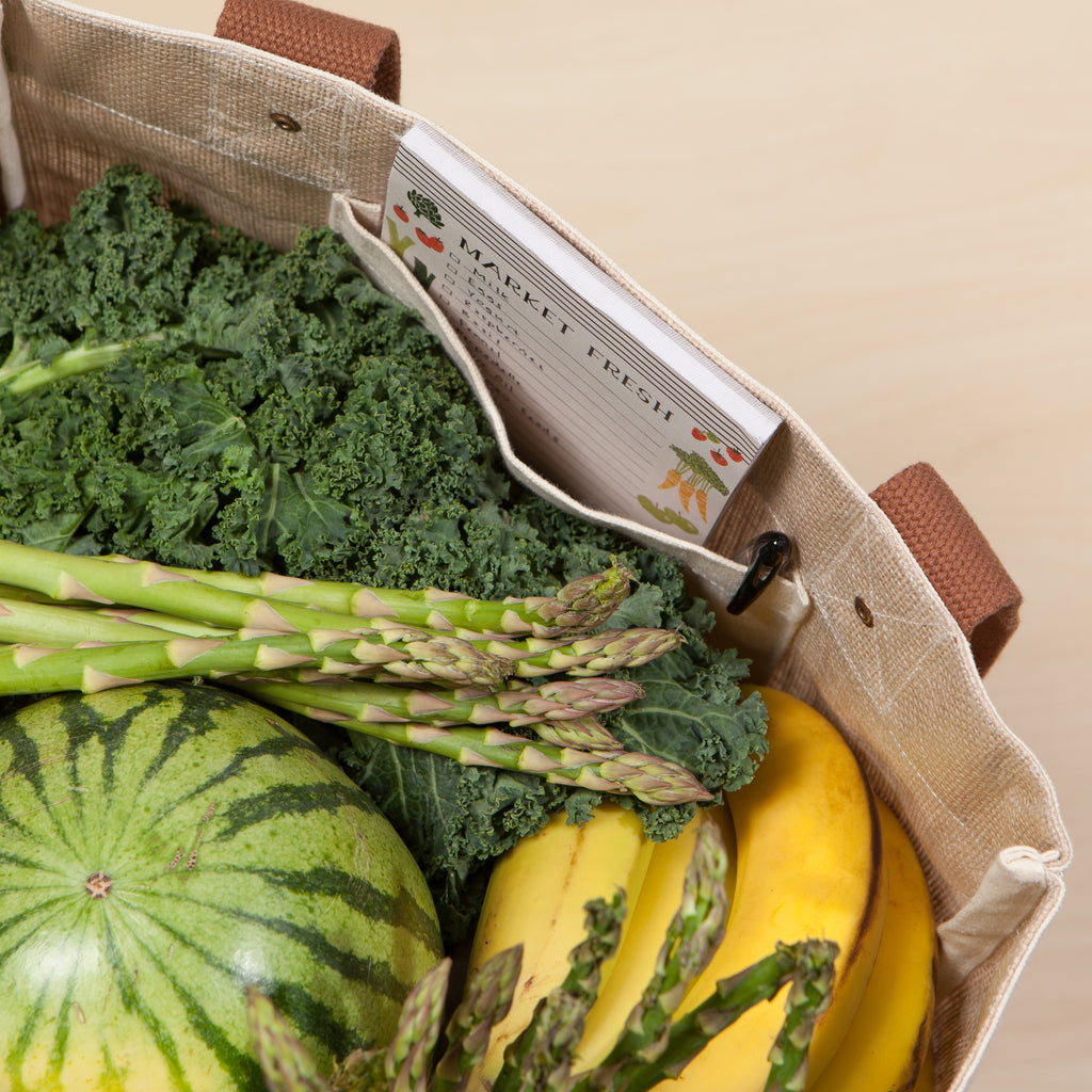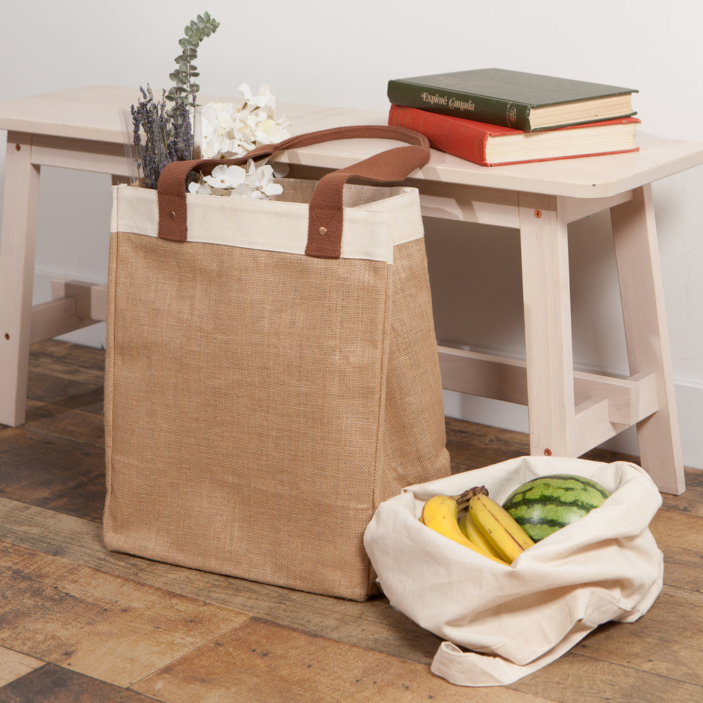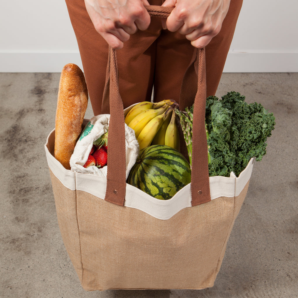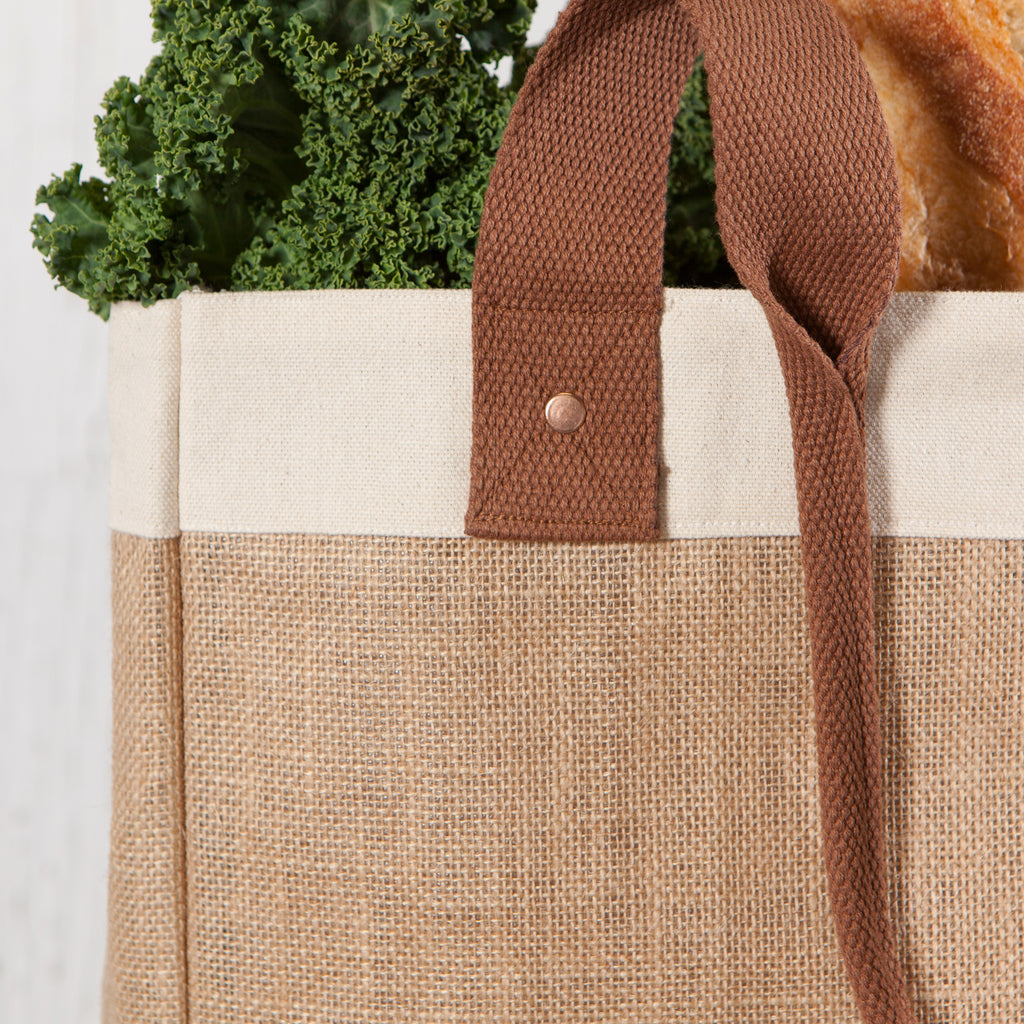 We love this bag! These handsome jute bags with canvas trim are roomy enough to bring home all of your market goods. The stiff base supports heavier loads and the inner pocket keeps your keys and wallet close at hand.