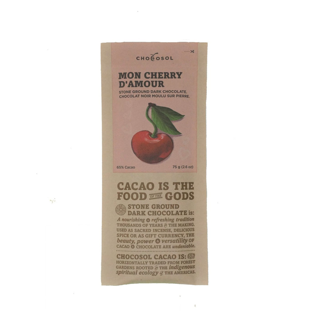 A classic combination of tart and sweet, this bar is sure to be please! Made with Chocosol's ever popular Vanilla Sea Salt 65% dark chocolate, this bar embeds organic dried cherries in each bite. These very special sour cherries from Niagara are first soaked in organic apple juice, giving them that perfect balance of tang and sweetness.