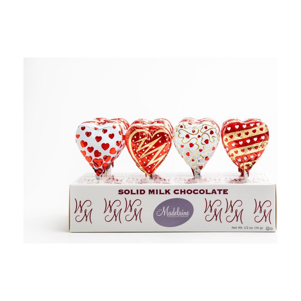 Sweeten your day with a milk chocolate heart-shaped lollipop wrapped in Italian foil. Creamy milk chocolate in a charming heart shape, making it a perfect, whimsical gift this Valentine's Day.