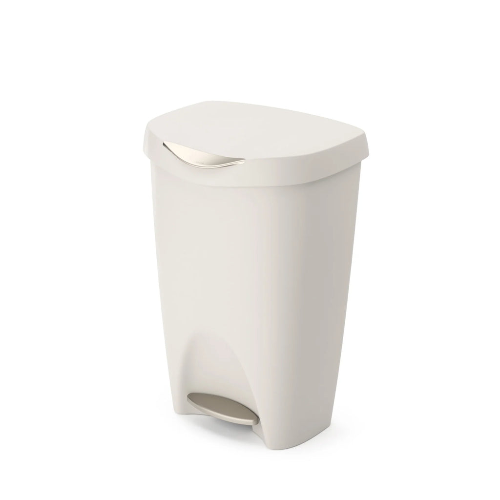 With its contoured lines and attractive satin finish, Brim provides an unexpected level of style that will compliment your kitchen decor. With a stainless-steel foot pedal, that triggers the innovative soft-close lid system, and a retention ring that holds the trash bag firmly in place while concealing it. The wide-top design makes garbage bag removal easy, while the polypropylene construction makes it durable and sturdy.