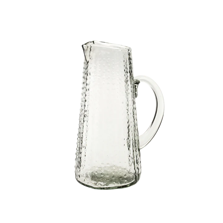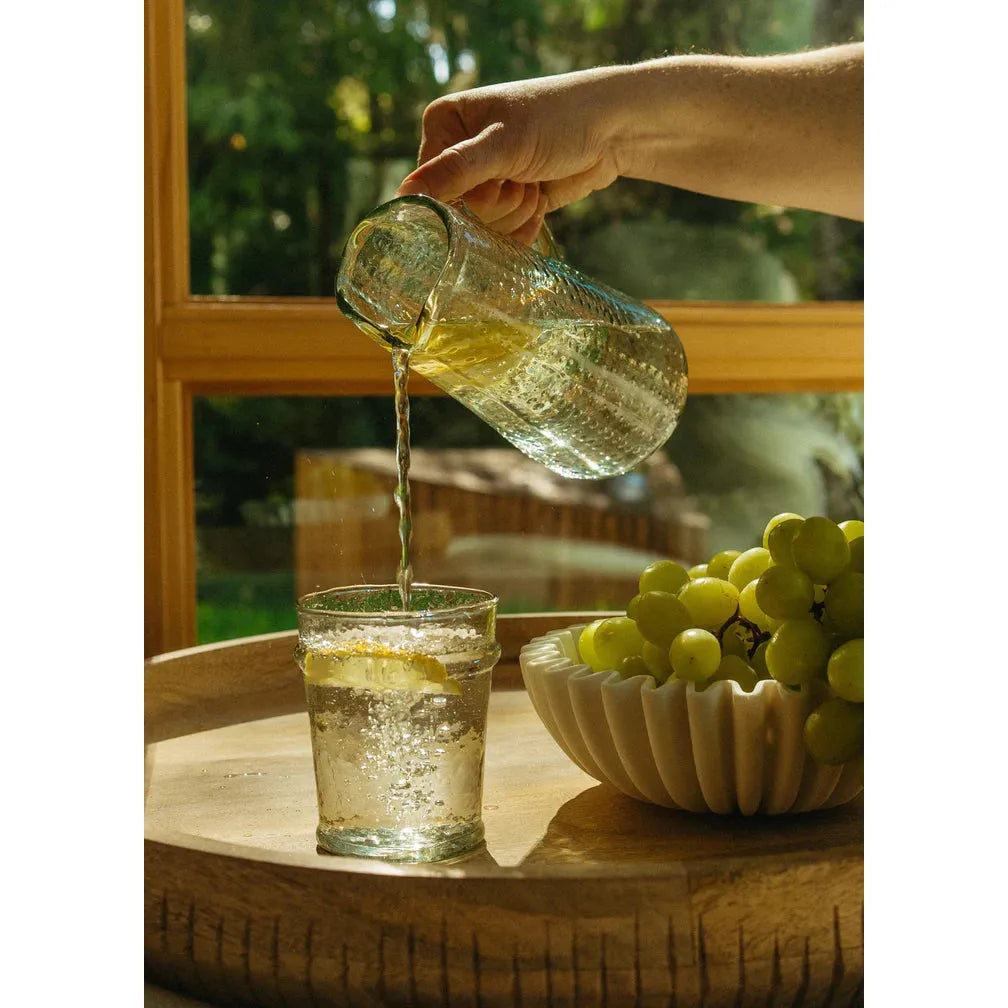 Crafted from recycled glass, the Small Waterfall Pitcher embodies our commitment to intentional living. Handmade by skilled artisans with a meticulous process of crushing, melting, and shaping, it offers a timeless and organic design that aligns with Indaba's dedication to both aesthetic beauty and environmental responsibility.